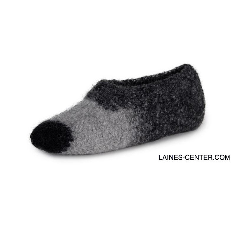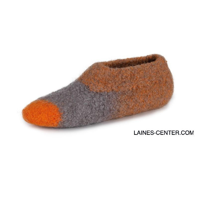 Il ne vous faut qu'une seule pelote, vous pouvez réaliser une paire de chausson à faire feutrer en machine à laver (40°C - cycle long) avec un bel effet de dégradé. Faites attention à prendre en compte une réduction du produit fini d'environ 30% de la taille quand vous feutrez votre ouvrage.